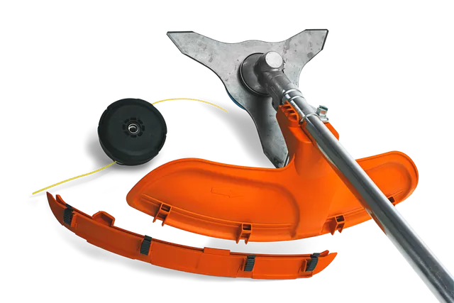 El accesorio de corte combinado con el protector se puede utilizar ya sea con una hoja de hierba o un cabezal de corte. -
