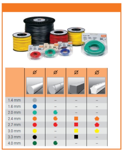 Los diferentes diámetros de las líneas de nylon se ajustan a los diferentes trabajos y exigencias con una máxima durabilidad. En diferentes presentaciones y con un código de colores para identificarlos más rápido. -